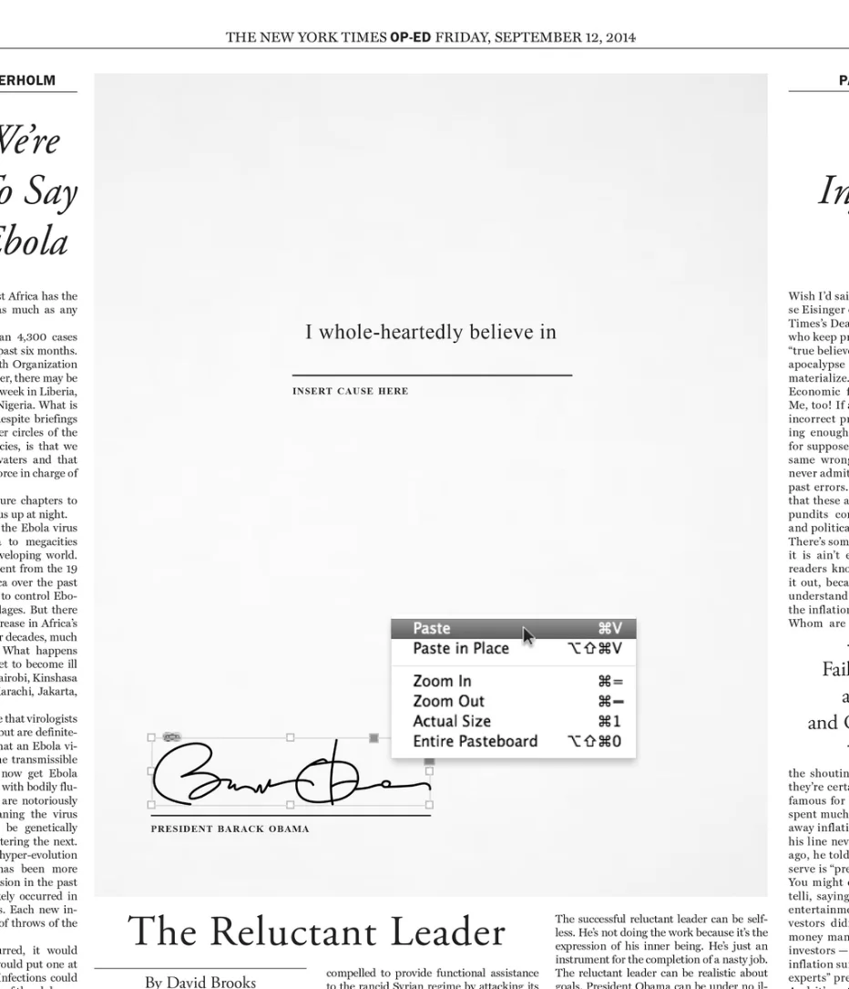 This mock New York Times Op-Ed piece was created in response to a class brief in Experimental Typography. Chose an article from the Friday Op-Ed of the given week and create a featured art piece using only typography. I chose to represent the article titled "The Reluctant Leader." The original Op-Ed spread had to be re-typeset and the design was required to be black and white.